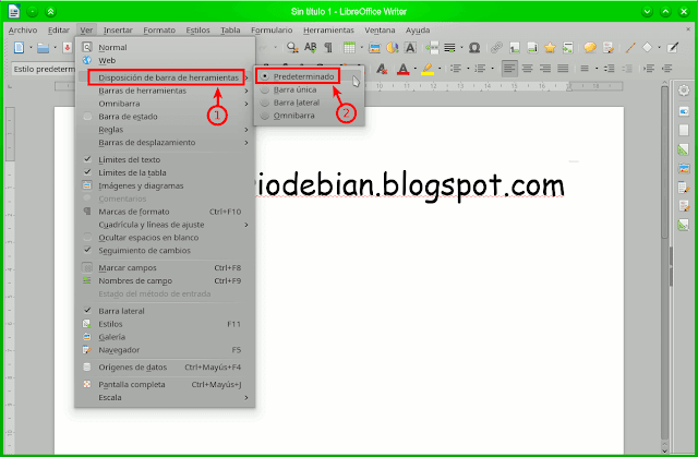De manera predeterminada, las órdenes de LibreOffice se agrupan en menús en cascada y en barras de herramientas con iconos.