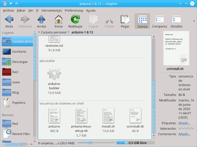 al finalizar, podemos observar como ha creado una carpeta con el nombre del programa (arduino-1.8.13).